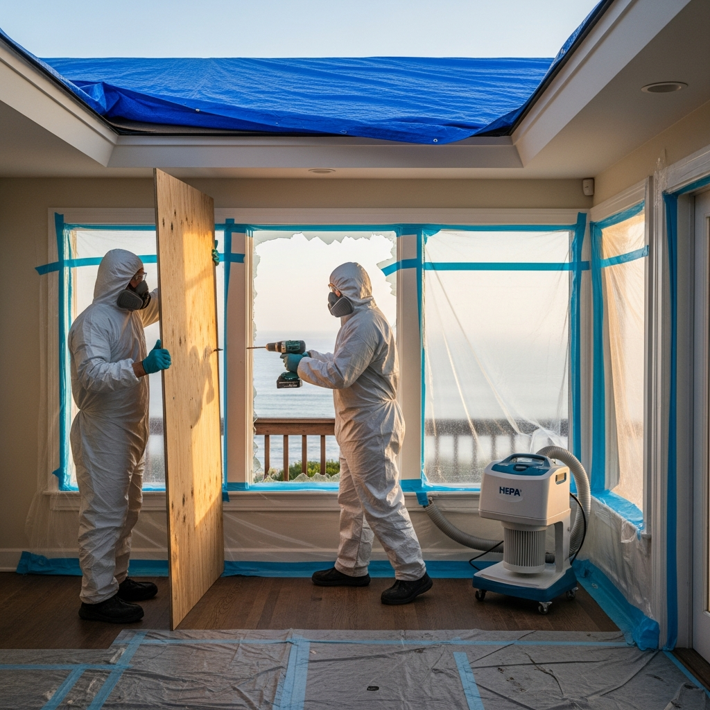 Once first responders declare the area safe to access, the priority becomes stabilizing your home. Broken windows are boarded; doors are secured; and roof openings are tarped before the evening marine layer can introduce moisture. Electricity and gas are checked; tripped breakers, damaged panels, or questionable appliances remain off until inspected. These immediate steps prevent additional damage and set the stage for thorough evaluation.