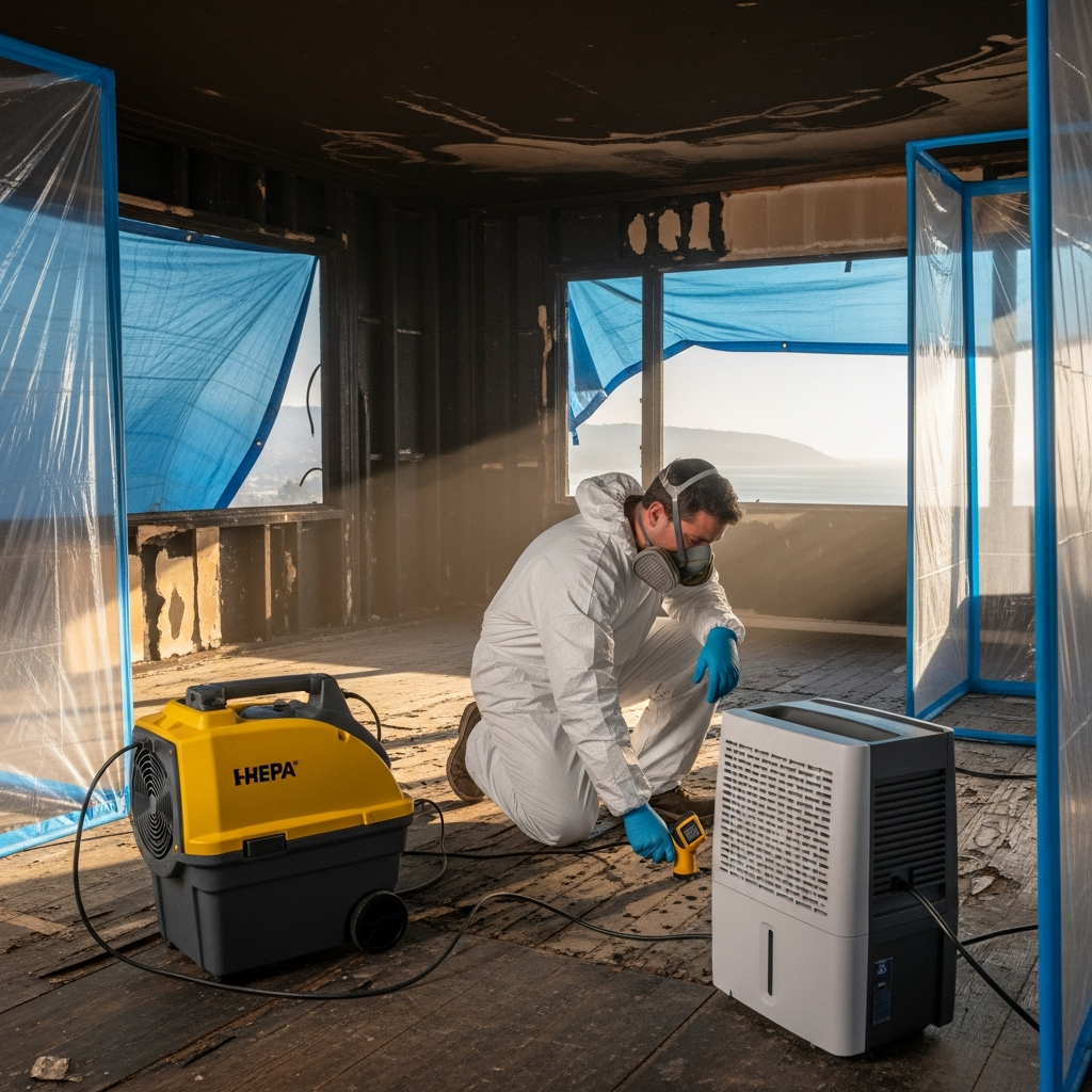 Safety comes first. Even if your property appears intact, the structure may have invisible hazards. Power may be intermittent; water lines may have been stressed by heat; and ash layers can hide nails or broken glass. A methodical site walk with appropriate protective equipment establishes safe access. Board-ups or temporary enclosures secure broken windows and doors. Tarping protects open roof areas from the next morning’s coastal moisture. In parallel, setting up negative air machines with HEPA filtration starts to pull contaminated air out of living spaces, moving the needle toward clean air quickly and preventing additional spread of soot.